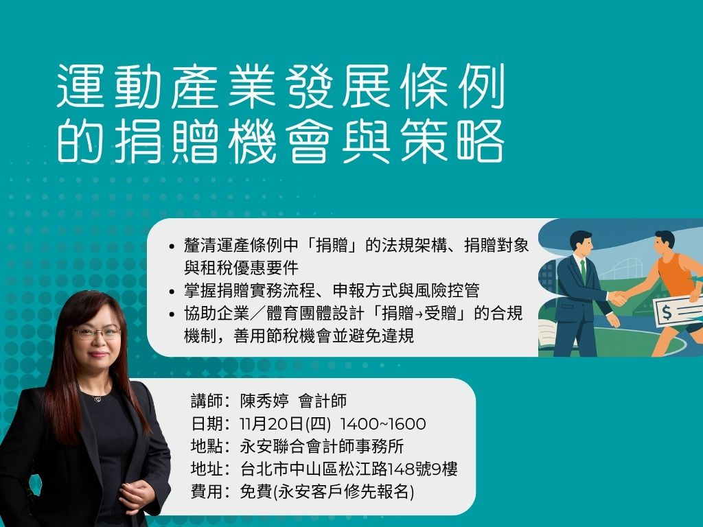 協助企業/體育團體設計「捐贈→受贈」的合規機制,善用節稅機會並避免違規