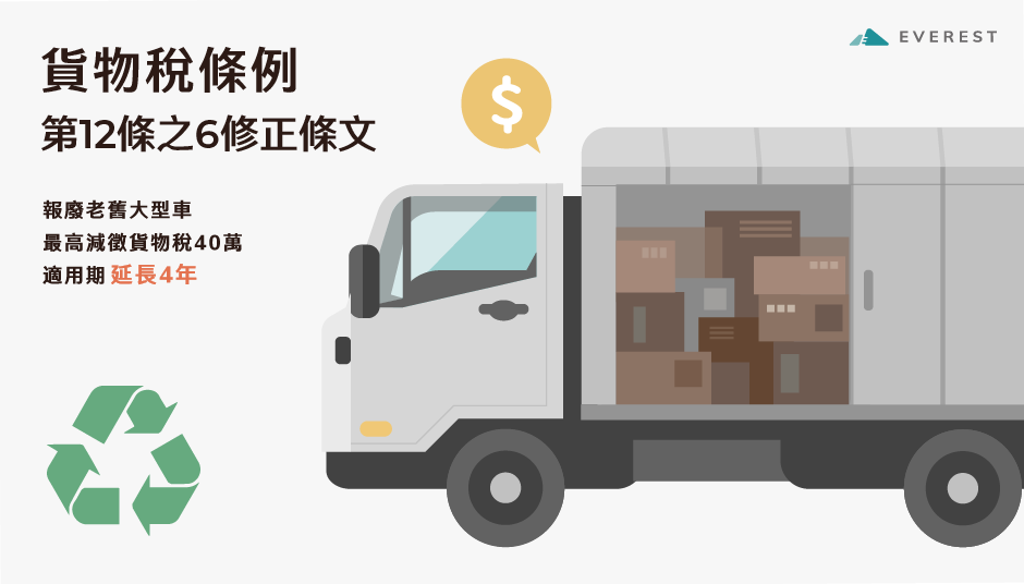本修正條文明定報廢一期至三期老舊大型柴油車並購買新大型車且完成新領牌照登記者,每輛新車最高減徵貨物稅新臺幣40萬元,其適用期間續延長4年,至115年12月31日止。 財政部表示,此次修正貨物稅條例,主要係為提升車主汰舊換新意願,以配合2050年淨零排放政策。該部將依行政院蘇院長指示,加強宣導該項節能減碳利民措施,俾利業界充分瞭解,以加速老舊大型柴油車汰舊換新。