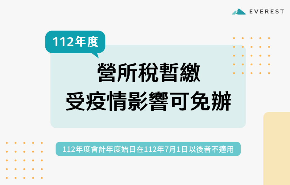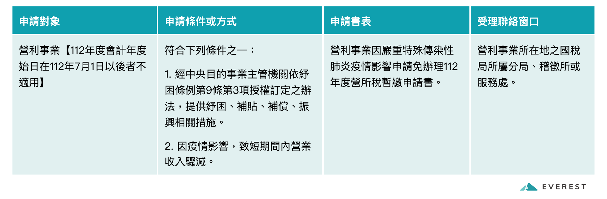 營利事業因疫情影響,於嚴重特殊傳染性肺炎防治及紓困振興特別條例施行期間內(109年1月15日至112年6月30日),符合下列情形之一,可於辦理112年度營所稅暫繳申報期間內,檢具申請書及相關證明文件,向所在地國稅局申請免辦理112年度營所稅暫繳: