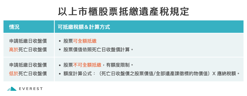 該局說明,納稅義務人申請以被繼承人所遺之上市或上櫃股票抵繳遺產稅,該股票除於申請抵繳日之收盤價較死亡日高者得全額抵繳外,應按比例抵繳,並以下列公式計算之金額為抵繳上限:〔繼承之上市或上櫃股票得抵繳遺產稅之限額=應納遺產稅額 ×(申請抵繳之上市或上櫃股票價值/全部課徵標的物價值)〕。