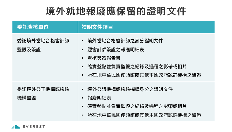 一、委託境外當地合格會計師監毀及簽證者,應取具境外當地合格會計師之身分證明文件、經會計師簽證之報廢明細表、查核簽證報告書、確實盤點並負責監毀之紀錄及過程之影帶或相片,並取得所在地中華民國使領館或其他經中華民國政府認許機構之驗證。 二、委託境外公證機構或檢驗機構監毀者,應取具足以證明該境外公證機構或檢驗機構身分之證明文件、報廢明細表、確實盤點並負責監毀之紀錄及過程之影帶或相片,並取得所在地中華民國使領館或其他經中華民國政府認許機構之驗證。