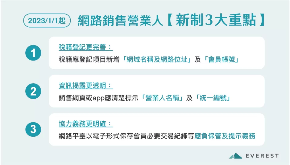 自112年1月1日起,營業人專營或兼營以網路平臺、行動裝置應用程式(APP)或其他電子方式銷售貨物或勞務(下稱從事網路銷售),其稅籍應登記項目新增「網域名稱及網路位址」及「會員帳號」,且營業人應於網路銷售網頁及相關交易應用軟體或程式清楚揭露「營業人名稱」及「統一編號」;專營或兼營以網路平臺、行動裝置應用程式(APP)或其他電子方式供他人銷售貨物或勞務(下稱平臺營業人),應負保管及提示會員交易紀錄之協力義務。