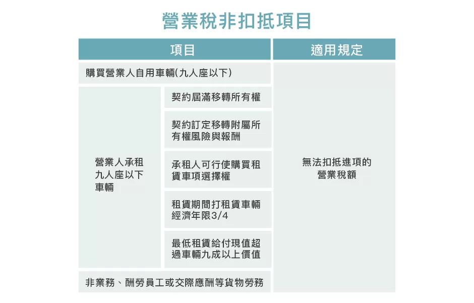 財政部高雄國稅局表示,依財政部111年1月7日台財稅字第11004648950號令,營業人承租非供銷售或提供勞務使用之九座以下乘人小客車,有下列情形之一者,核屬分期付款買賣性質,依加值型及非加值型營業稅法19條第1項第5款規定,其支付之進項稅額不得扣抵銷項稅額: