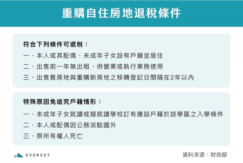所得稅法第14條之8規定,個人出售依房地合一新制課徵所得稅的自住房地,與自完成移轉登記日起算2年內重購的自住房地,均由本人或其配偶、未成年子女設有戶籍並居住,且無出租、供營業或執行業務使用,其出售自住房地所繳納的房地合一稅,可於重購自住房地完成移轉登記的次日起算5年內,申請按重購價額占出售價額的比例退還。