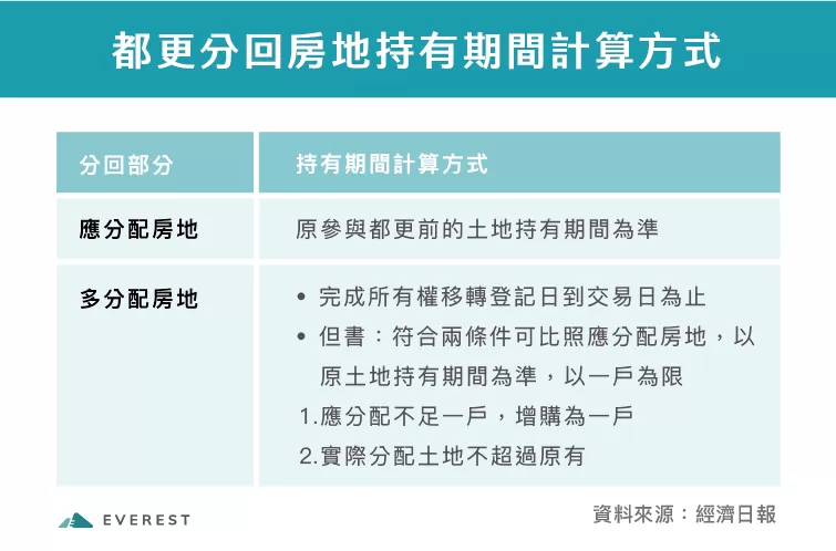 (二)應分配之房屋、土地之持有期間,以原取得參與都市更新前土地之持有期間為準;多分配之房屋、土地之持有期間,自該多分配部分房屋、土地取得之日起算至交易之日為止。但多分配之房屋、土地,係應分配之房屋、土地持分合計數因有未足完整一戶房屋及土地面積單元而增購為完整一戶,且應分配及多分配土地面積合計不超過都市更新前原有土地面積者,其持有期間得以該一戶應分配土地之持有期間為準,並以一戶為限(詳釋例)。